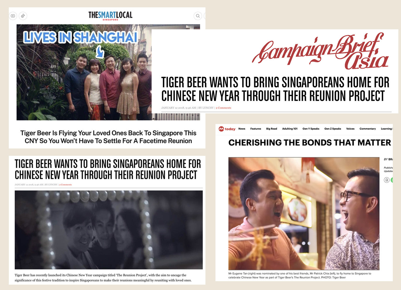 This Chinese New Year, as part of the Reunion Project, Tiger Beer wanted to remind people that no matter how far, when home calls, you answer. Because it only happens once a year. So, make it count.